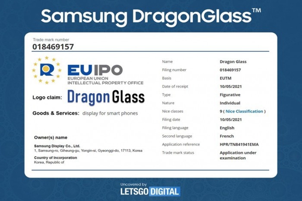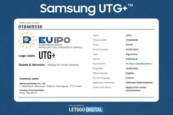 援引荷蘭媒體 LetsGoDigital 報道,三星顯示公司于 2021 年 5 月 10 日向歐盟知識產權局(EUIPO)提交了 4 個帶有附帶標識的商標。這些商標分別為 UTG 2.0, UTG+, S-UTG 和 DragonGlass。所有這 4 個商標的描述都提到了“智能手機的屏幕”。