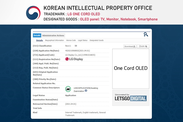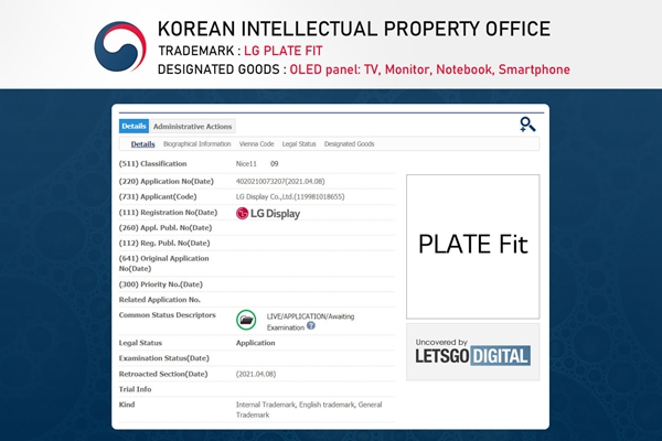 2021年5月3日,LG Display向韓國知識產(chǎn)權(quán)局(KIPO)提交了六項商標(biāo)申請。內(nèi)容包括:Plate、OLED Plate、Smart Plate、Plate Big、Plate Fit和One Cord OLED。