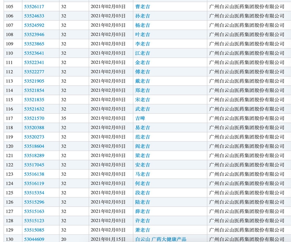 公開信息顯示,1986年廣州白云山醫藥集團股份有限公司在藥品、醫用和獸醫用制劑類的第5類商品和服務上申請了王老吉商標。1987年,該公司在涼茶所屬的30類商品上申請了王老吉商標。接著,每隔幾年,該公司就在包括“無酒精飲料、固體飲料”在內32類等商品品類上,申請了王老吉商標,目前該商標已覆蓋了大部分的商品和服務。此外,該公司還在多品類商品上申請過“王老吉 1828”、“王老吉大健康”等商標。