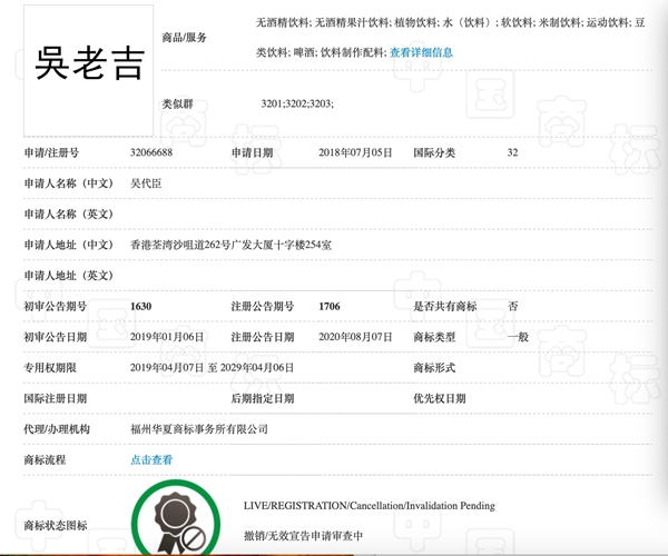 中國商標網公示信息顯示,早在2018年7月,一個名叫“吳代臣”的人已在32類商品中申請了“吳老吉”商標。該商標包含了啤酒、茶味非酒精飲料;、無酒精飲料、果汁、植物飲料、水(飲料)、 蒸餾水(飲料)、能量飲料、純凈水(飲料)等,與目前王老吉申請的“姓氏+老吉”飲料的商品范圍重合。“吳老吉”商標于2020年8月7日注冊公告,專用權期限為2019年4月7日至2029年4月6日。