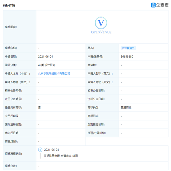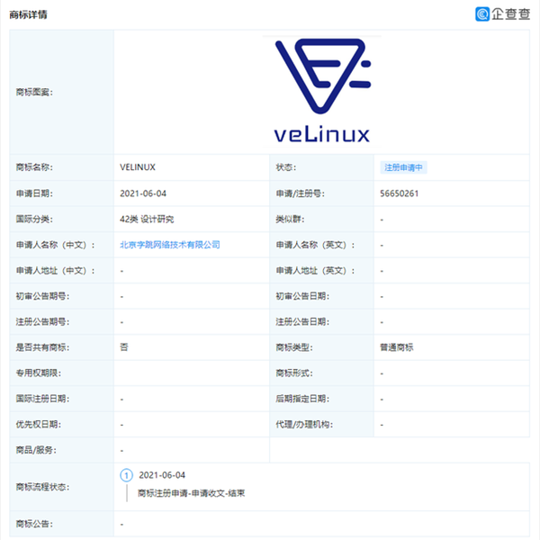 企查查顯示,字節(jié)跳動關聯(lián)公司北京字跳網(wǎng)絡技術有限公司于近日申請注冊veLinux操作系統(tǒng)、OpenVenus、云雀協(xié)同、云雀辦公相關商標。