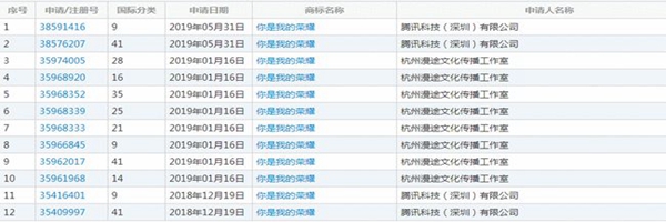 2018年12月19日,顧漫尚未將小說創作完成時,騰訊公司就分別在第9類和第41類將“你是我的榮耀”作為商標申請注冊。