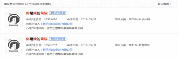 2019年5月31日,騰訊公司重新對“你是我的榮耀”商標圖樣進行設計,加入了獨創設計的“榮耀夫婦”和衛星的圖形元素,修改之后的商標因具有顯著性,目前已經獲準注冊。