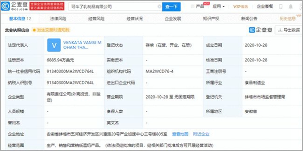 企查查App顯示,可牛了乳制品有限公司注冊資本為6885.94萬美元,法定代表人為VENKATA VAMSI MOHAN THATI,經營范圍包含生產、銷售和營銷低溫奶產品等。