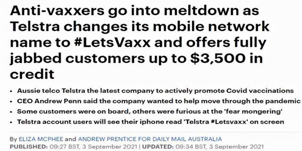 為了呼吁接種疫苗做出改變的頂級公司不只是NAB一家,澳洲最大的網絡和手機服務供應商Telstra也為呼吁接種疫苗做出了改變。