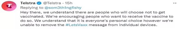 但是Telstra此舉激怒了反疫苗群體,一些人威脅要抵制該公司。一位客戶非常不滿,表示:“能不能把我手機里的‘Letsvaxx’標示取消?否則我就停用了。”