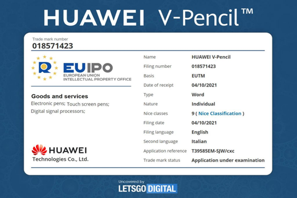 據悉,最新的爆料顯示,華為技術有限公司于10 月 4 日向歐盟知識產權局(EUIPO)申請了“Huawei V-Pencil”商標。