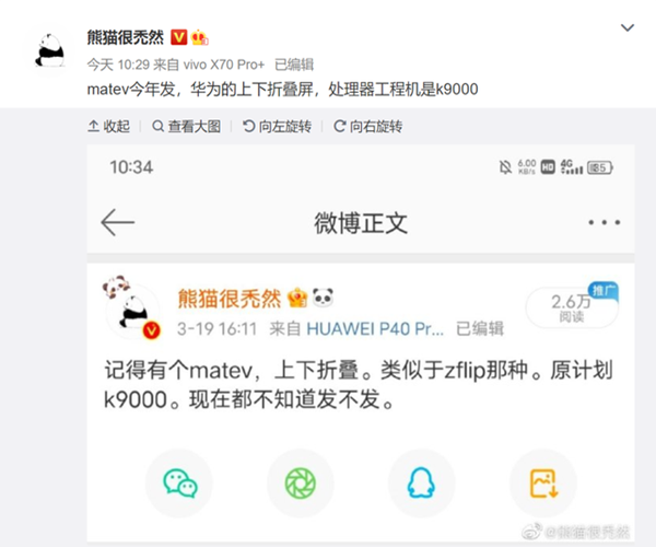 不過,早在上個月,博主@熊貓很禿然 就在爆料中提到,“matev今年發,華為的上下折疊屏,處理器工程機是k9000”。