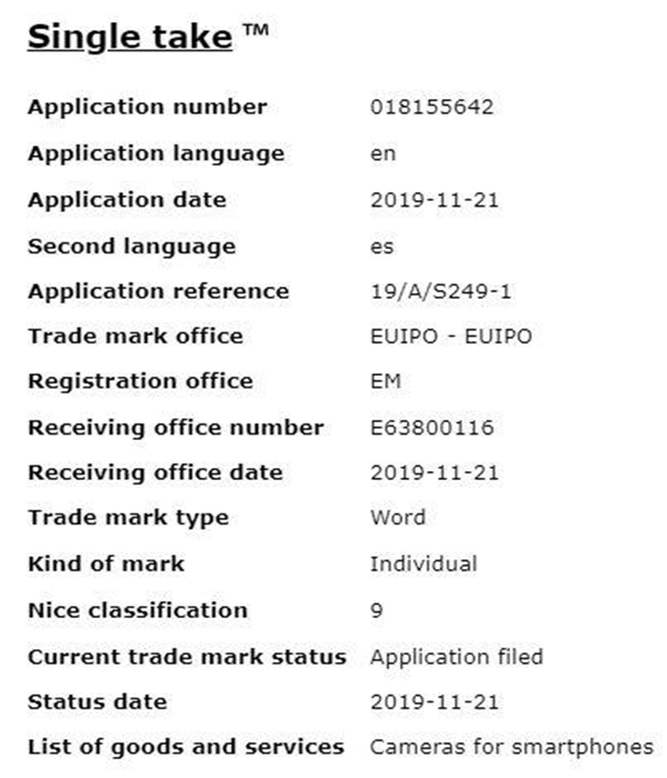 顧名思義,“Single Take”或與拍照功能有關,而“Video Spin”顯然與視頻功能有關。兩份商標均屬于第九類,其中包括智能 手機 、電腦、軟件、平板、可下載和錄制的計算機應用、創建 / 編輯 / 保存攝影和錄像等。