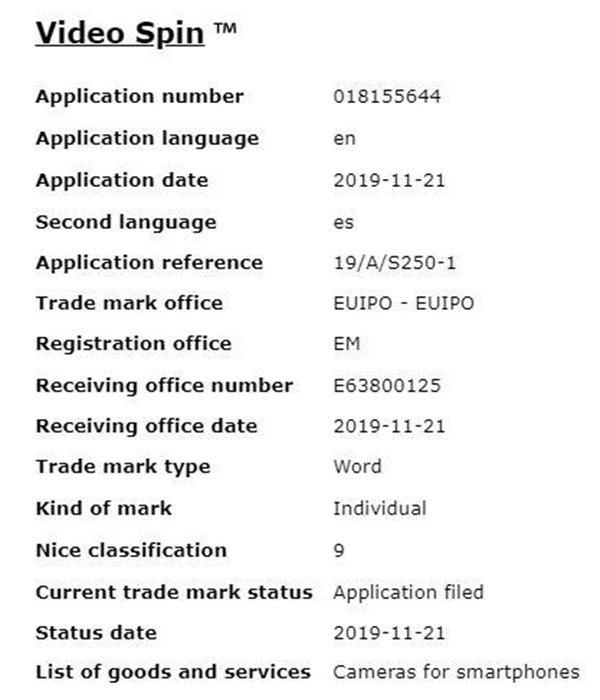 根據目前已知的信息,三星 Galaxy S11 產品線或有三款不同的機型。除了入門級的 Galaxy S11e,預計還有標準版和 Plus 版。 有趣的是,荷蘭科技博客近日爆料稱,三星剛剛向歐盟知識產權局(EUIPO)提交了兩個與拍攝功能有關的新專利,且有望在 Galaxy S11 上配備。 據悉,三星于 2019 年 11 月 21 日向 EUIPO 提交了“Single Take”和“Video Spin”這兩個商標申請。