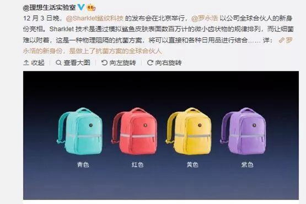 羅永浩表示,Sharklet技術可能是目前全球唯一一種通過純物理微結構達到抗菌防污的技術,并現場展示了帶有Sharklet抗菌材料的地平線8號抗菌兒童背包、鋁鎂商務旅行箱。