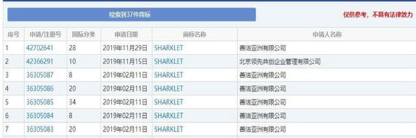 以“sharklet”在中國商標網進行關鍵詞檢索發現,總共有5家公司注冊了該商標,其中只有兩家公司與羅永浩發布會上提到的Sharklet技術有關系,商標注冊最多的是一家名為善潔亞洲有限公司(Sharklet Asia Limited)。資料顯示,這是一家注冊在中國香港地區的公司,多方信息推測很有可能就是羅永浩擔任合伙人的Sharklet公司的相關方。