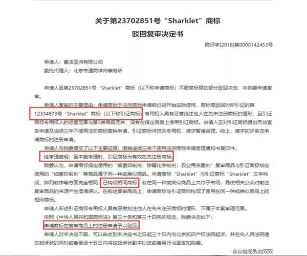 “善潔亞洲有限公司”不服商標局的駁回決定,向商標局提起駁回復審。原商標評審委員會于2018年8月作出決定,除了對一件第44類“Sharklet”商標予以初步審定外,對其他的四件第5類、第42類“Sharklet”商標注冊申請仍然予以駁回。