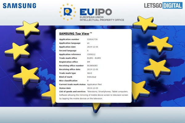 根據2019年12月5日歐盟知識產權局(EUIPO)公示的信息,三星獲得了名為“Samsung Tap View”的新商標。該商標分類為Class 9,商標描述為“電視;智能手機;平板電腦;自然界中的可穿戴計算機或智能手表和智能眼鏡;智能手表電視監視器;視頻監視器;只需要在移動設備點擊就能投屏到到電視上,能夠將其顯示在電視/顯示器上的軟件;通過點擊電視上的移動設備,允許將鏡像或移動設備屏幕顯示到電視屏幕的軟件?!?