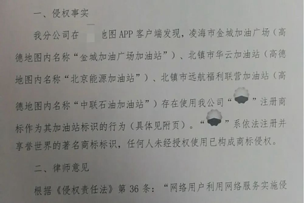 為盡快制止社會加油站對中國石油品牌形象造成的侵權,維護中國石油昆侖加油卡用戶的切身利益,3月5日,中國石油遼寧錦州銷售分公司在做好證據保全工作后,分別向侵權加油站和某導航電子地圖公司發出律師函,表明侵權事實和律師意見,要求對侵權商標標識予以撤換、刪除。