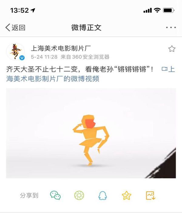 這次上海美術電影制片廠新廠標中左側圖案就是以中國經(jīng)典神話人物齊天大圣孫悟空為原型設計的。