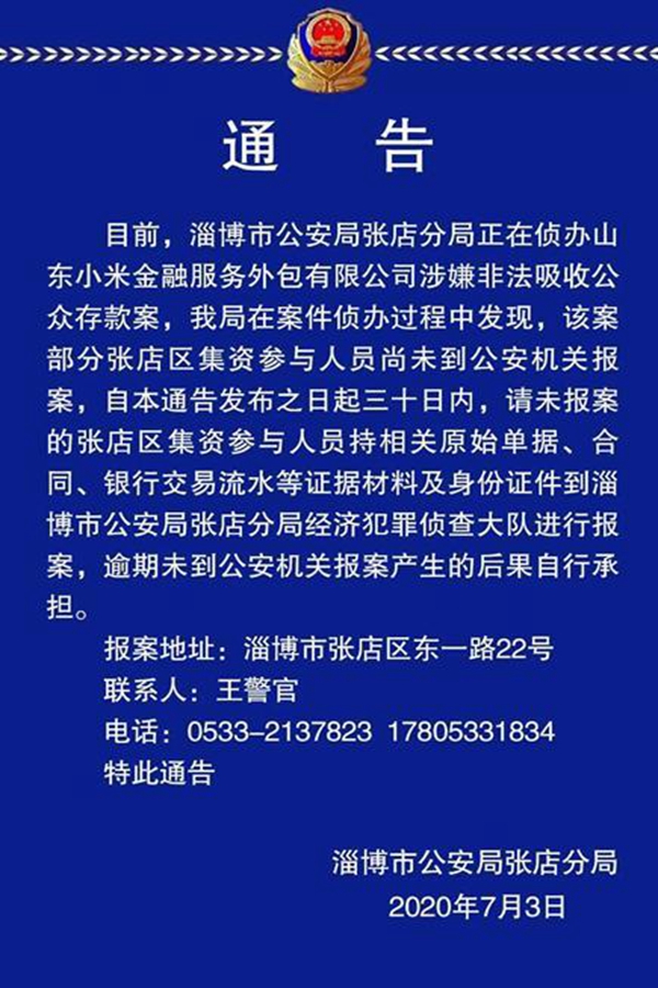 2020年5月,淄博市公安局博山分局發布通告,表示正在偵辦山東小米金融服務外包有限公司業務員欒某某等人涉嫌非法吸收公眾存款案。7月3日,山東省淄博市公安局張店分局再次發布通告,表示正在偵辦稱正在偵辦山東小米金融涉嫌非法吸收公眾存款案,請張店區集資參與人員報案。