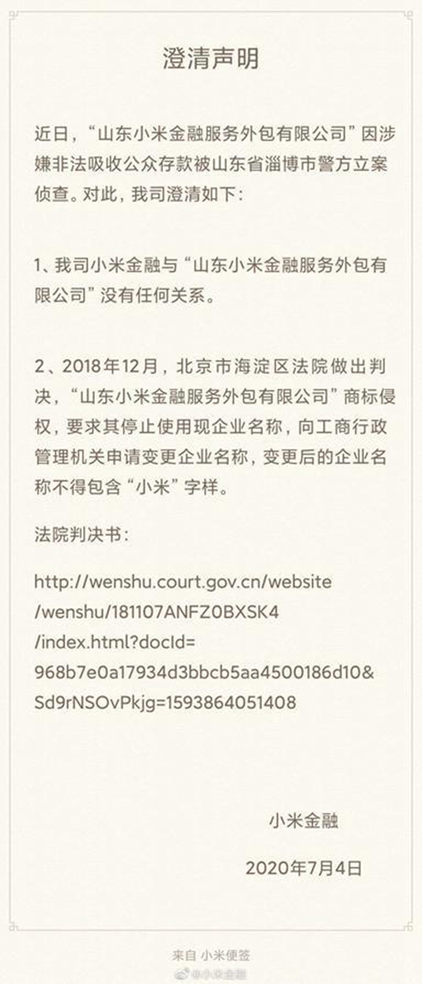 對此,7月4日,小米金融發布澄清聲明稱,其與“山東小米金融服務外包有限公司”沒有任何關系。并且還貼出2018年12月底的法院判決書,以此力證“清白”。