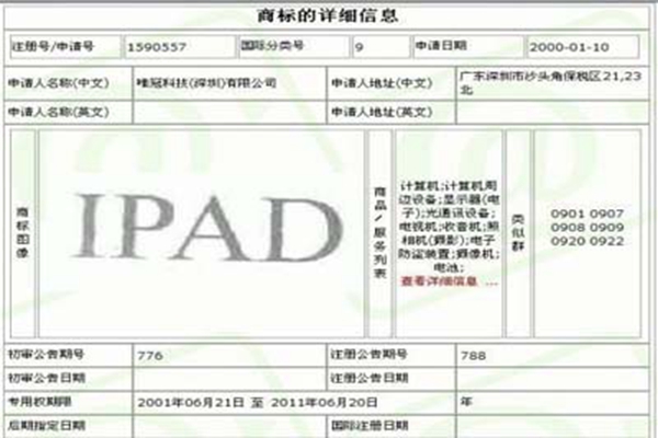 根據專業商標注冊查詢系統查詢可知“IPAD”商標在計算機行業也就是商標第9類注冊人是唯冠科技(深圳)有限公司,“IPAD”商標注冊請求日期是2000年1月10日,“IPAD”商標初審日期是2001年03月21日,“IPAD”商標注冊日期是在2001年06月21日,“IPAD”商標注冊號為1590557,運用產品包括計算機,計算機周邊設備,顯示器(電子),光通訊設備,電視機,收音機,照相機(攝影),電子防盜設備,攝像機,電池,備注:總第**6期第1240期P**30頁送達公告關于供給注冊商標運用證據的告訴,日期:2010.11.21;續展待審中[2010-03-22];續展完成[2011-01-07]。